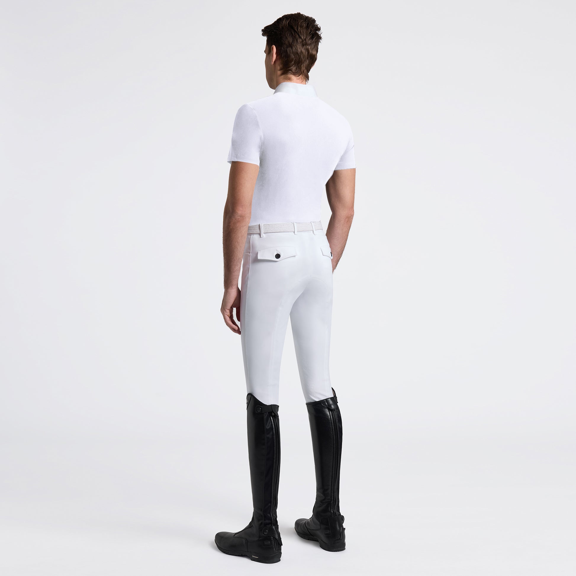 The Cavalleria Toscana men's short-sleeve competition shirt is designed to provide elegance and high performance. Made from breathable, stretch technical fabric, it ensures maximum comfort and freedom of movement. The design includes hidden snap buttons, a white poplin collar, and a thermo-applied 3D CT logo on the chest, adding a modern and sophisticated touch. Perfect for competitions and formal events, this shirt combines functionality with impeccable style.