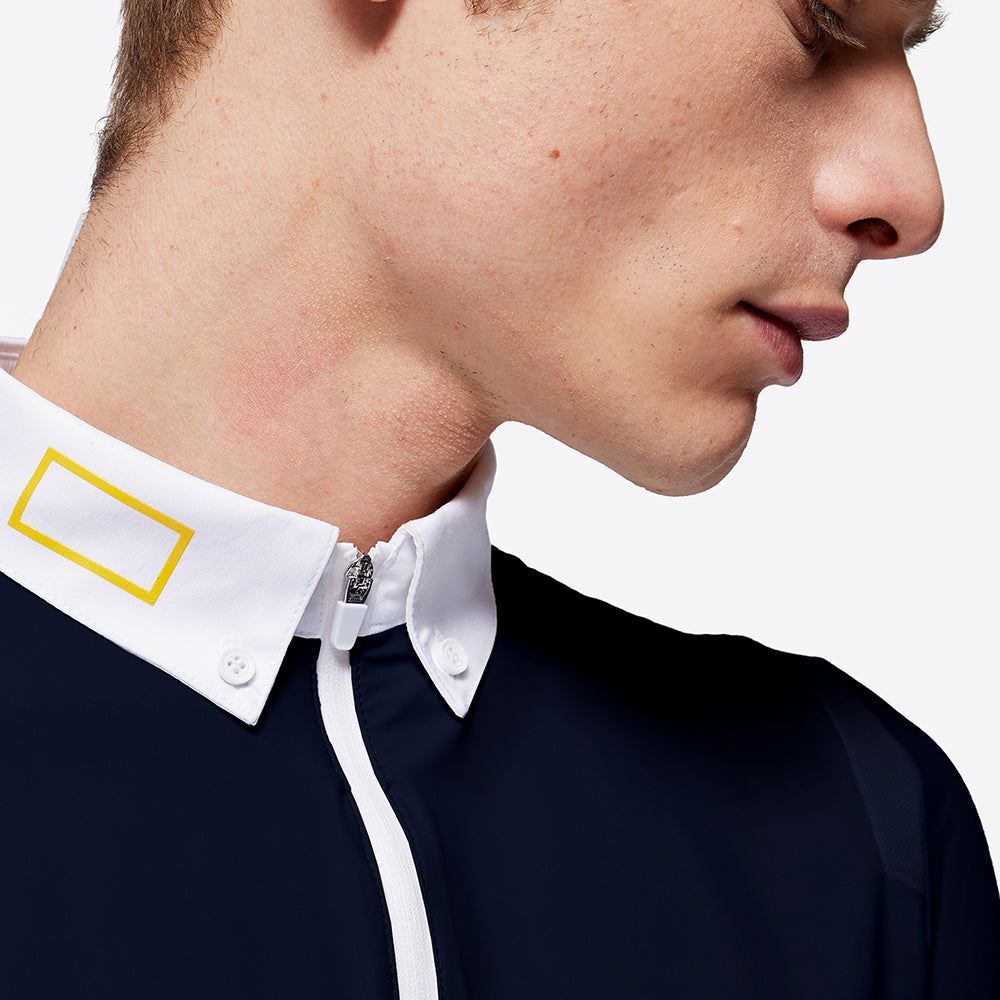Men's competition polo shirt, poplin collar with botton-down and front zip.Made of stretch technical jersey pique with mesh inserts able to adapt to every movement of the body giving greater breathability.Cotton and nylon intersect in a material that reinterprets the classic pique giving the garment an innovative design that maintains softness and elasticity.4-Season Jersey, lightweight and odor resistant.Zip with rubber reinforcement and logo on collar and left sleeve.